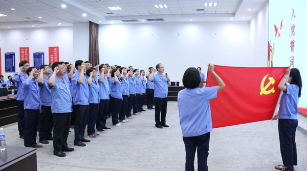 (黨支部書記、董事長王煥一領(lǐng)誓) “起來,不愿做奴隸的人們……”在嘹亮而莊嚴(yán)的國歌聲中,大會正式開始。“我志愿加入中國共產(chǎn)黨,擁護(hù)黨的綱領(lǐng),遵守黨的章程……”在公司黨支部書記、董事長王煥一領(lǐng)誓下,全體黨員重溫入黨誓詞,堅定有力的聲音響徹全場。